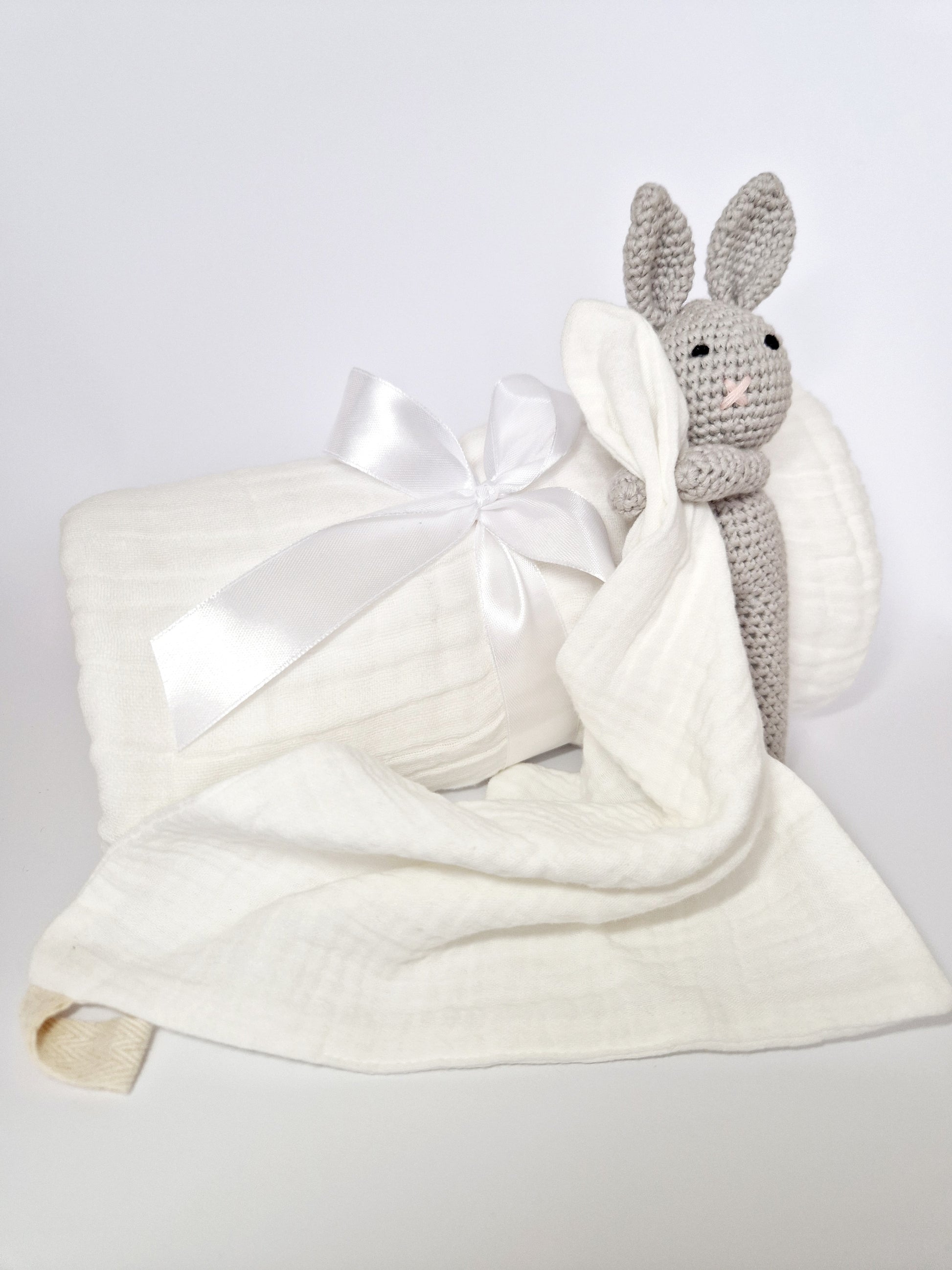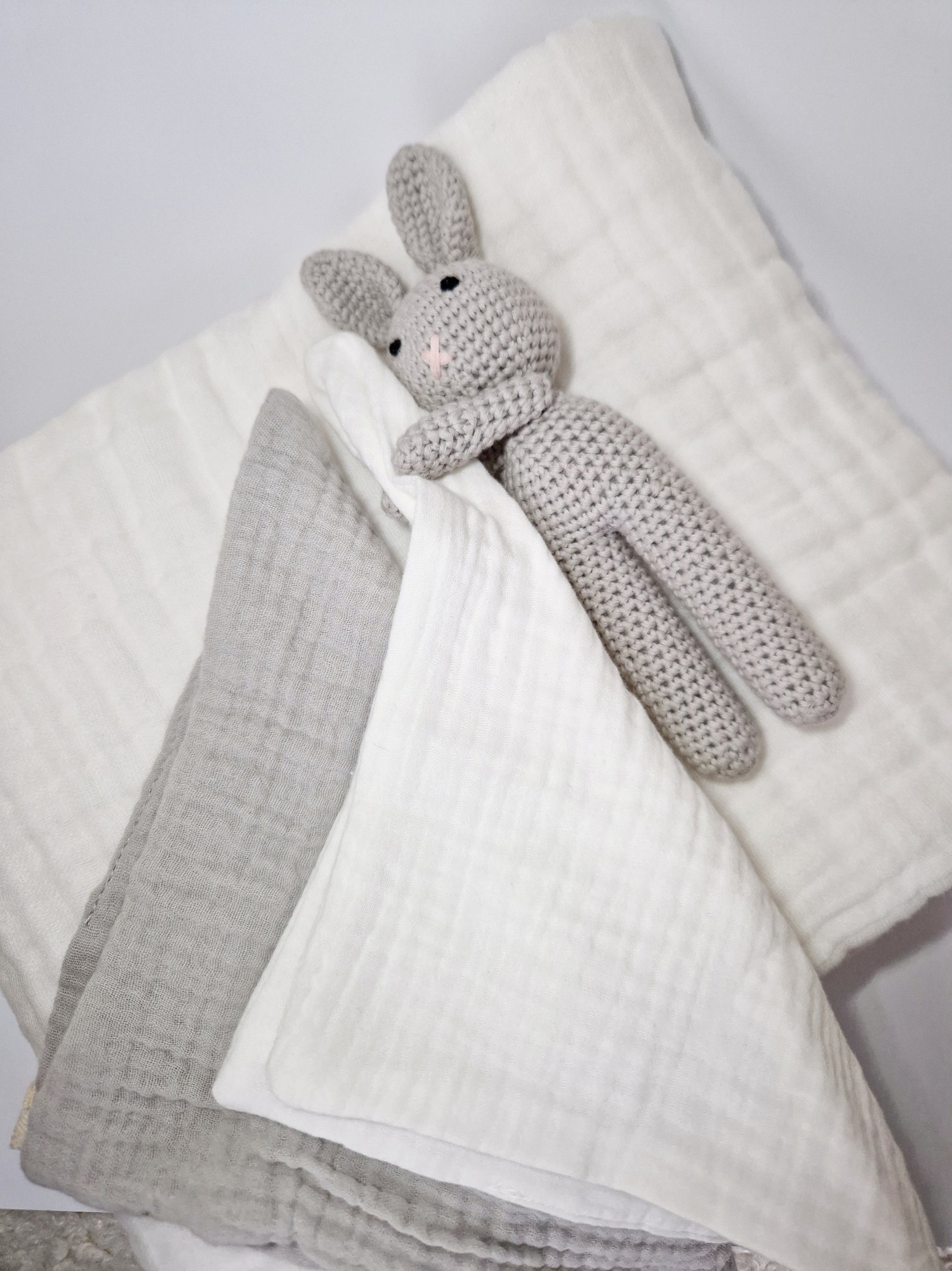 Megztas zuikutis su muslino migduku – mielas, švelnus draugas, suteikiantis saugumo jausmą ir padedantis ramiai užmigti.