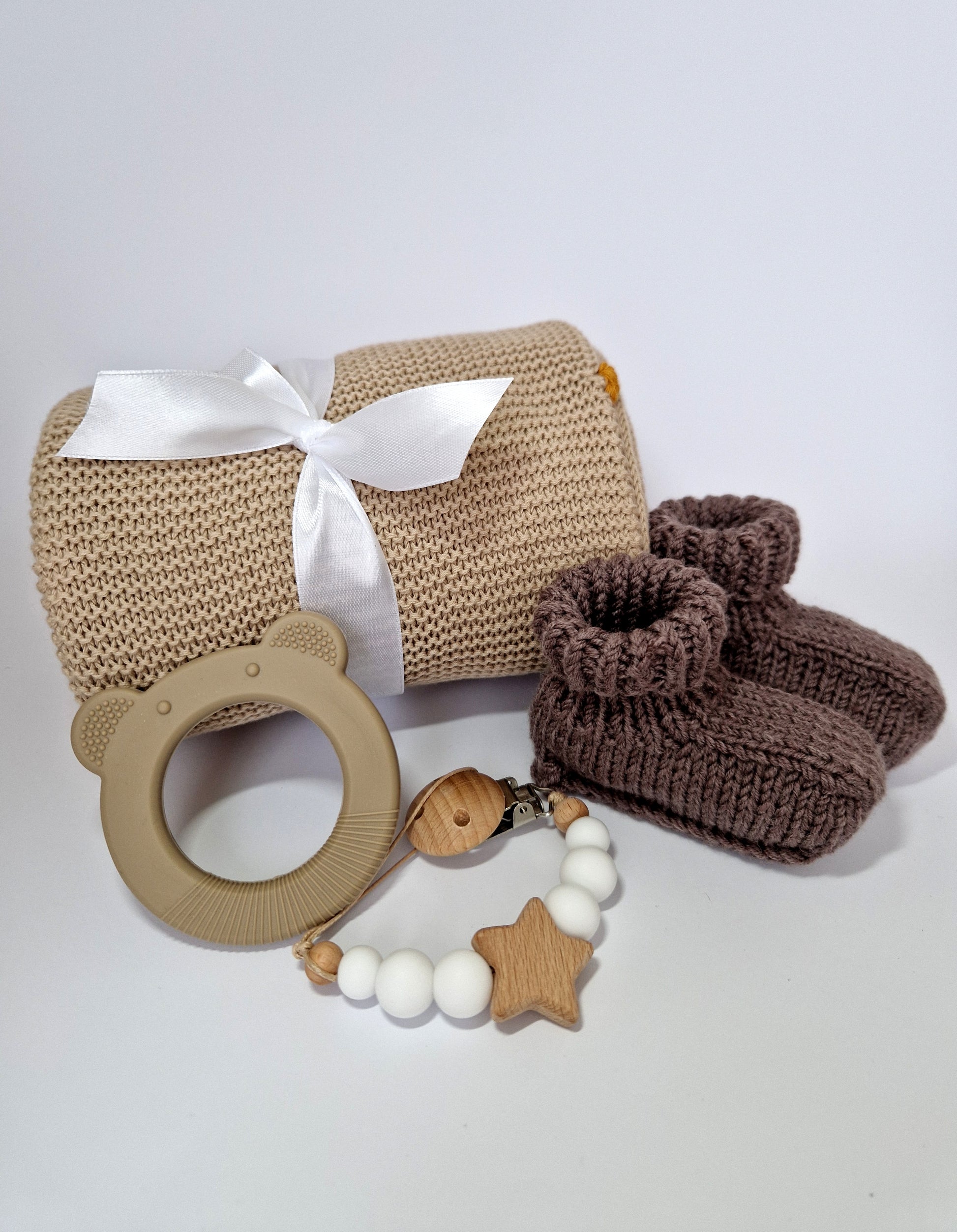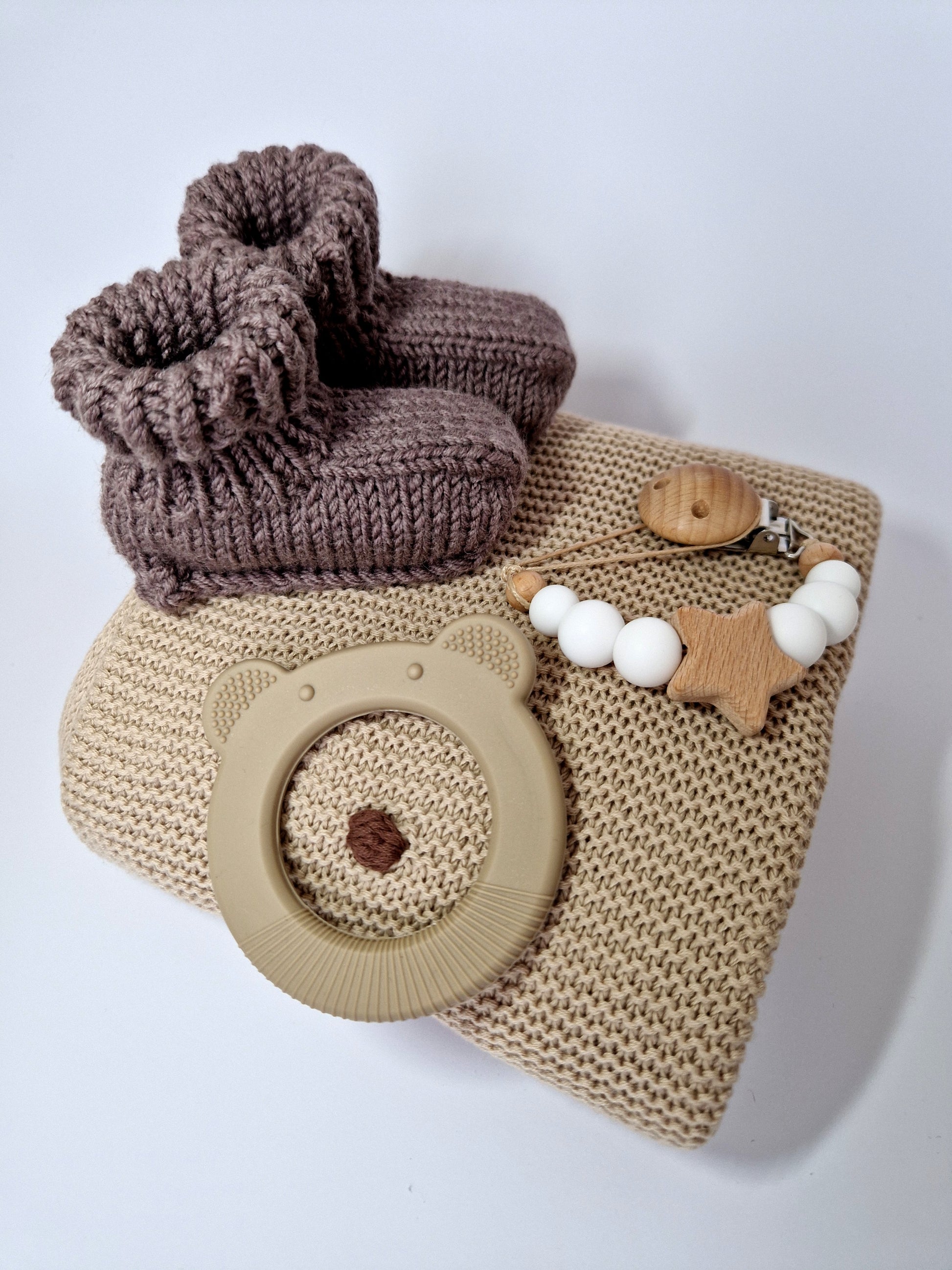 Žemiškos rudos spalvos ir natūralios medžiagos suteikia jaukumo bei komforto, todėl tai puiki dovana naujagimiui ar kūdikio sutiktuvių proga.